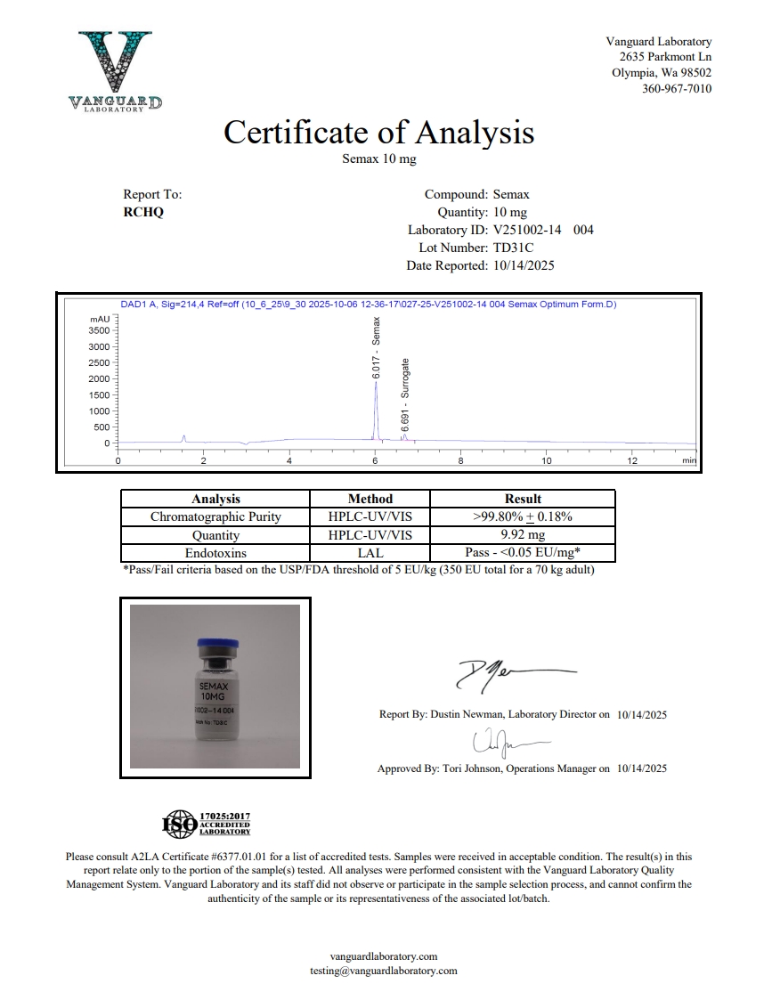Semax (10mg) is a synthetic peptide analog derived from a fragment of the adrenocorticotropic hormone (ACTH₄₋₁₀). It has been widely utilized in advanced neuroscience research focused on cognitive function, neuroprotection, and neural plasticity. Semax allows investigators to explore mechanisms related to BDNF modulation, stress response pathways, and central nervous system regulation. This product is provided strictly for laboratory research use only and is not intended for human or veterinary applications.